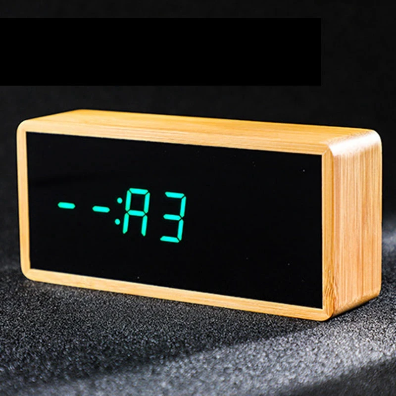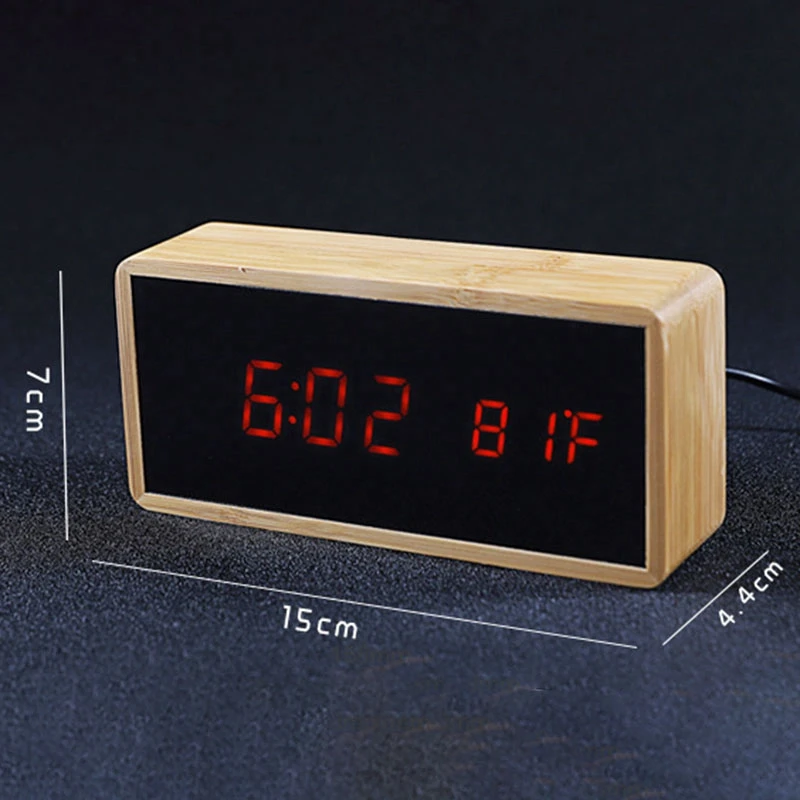 HOT Bamboo Wooden Mirror Alarm Clocks Temperature Sounds Control Desktop Clock With Digital Watch E